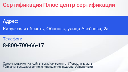 Сертификация Плюс, центр сертификации по адресу Калужская область, Обнинск, улица Аксёнова, 2а в дальнейшем Организация, размещена в следующих категориях: