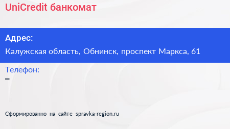 UniCredit, банкомат по адресу Калужская область, Обнинск, проспект Маркса, 61 в дальнейшем Организация, размещена в следующих категориях: