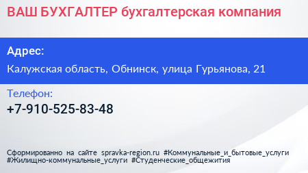 ВАШ БУХГАЛТЕР, бухгалтерская компания по адресу Калужская область, Обнинск, улица Гурьянова, 21 в дальнейшем Организация, размещена в следующих категориях: