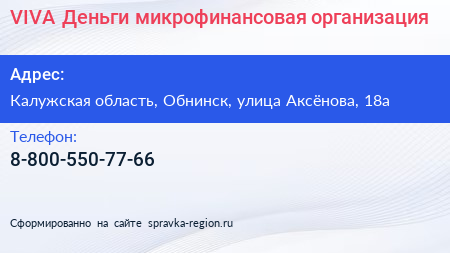 VIVA Деньги, микрофинансовая организация по адресу Калужская область, Обнинск, улица Аксёнова, 18а в дальнейшем Организация, размещена в следующих категориях: