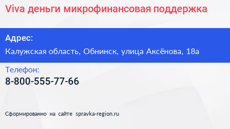 Viva деньги, микрофинансовая поддержка по адресу Калужская область, Обнинск, улица Аксёнова, 18а в дальнейшем Организация, размещена в следующих категориях: