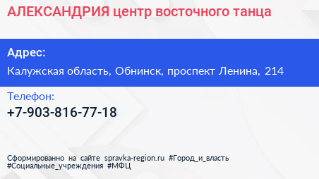 АЛЕКСАНДРИЯ, центр восточного танца по адресу Калужская область, Обнинск, проспект Ленина, 214 в дальнейшем Организация, размещена в следующих категориях: