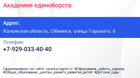 Академия единоборств по адресу Калужская область, Обнинск, улица Горького, 6 в дальнейшем Организация, размещена в следующих категориях: