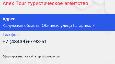 Anex Tour, туристическое агентство по адресу Калужская область, Обнинск, улица Гагарина, 7 в дальнейшем Организация, размещена в следующих категориях: