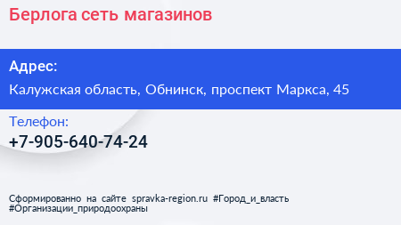 Берлога, сеть магазинов по адресу Калужская область, Обнинск, проспект Маркса, 45 в дальнейшем Организация, размещена в следующих категориях: