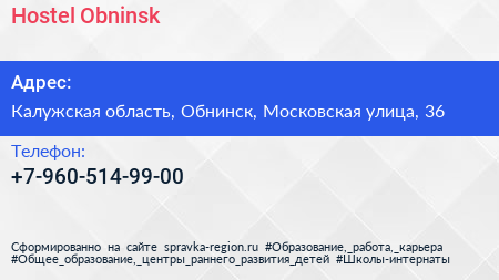 Hostel Obninsk по адресу Калужская область, Обнинск, Московская улица, 36 в дальнейшем Организация, размещена в следующих категориях: