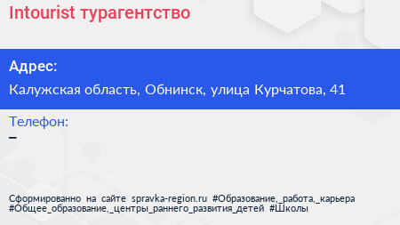 Intourist, турагентство по адресу Калужская область, Обнинск, улица Курчатова, 41 в дальнейшем Организация, размещена в следующих категориях: