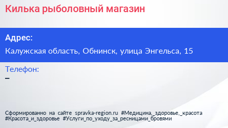 Килька, рыболовный магазин по адресу Калужская область, Обнинск, улица Энгельса, 15 в дальнейшем Организация, размещена в следующих категориях:
