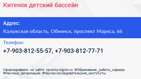 Китенок, детский бассейн по адресу Калужская область, Обнинск, проспект Маркса, 66 в дальнейшем Организация, размещена в следующих категориях: