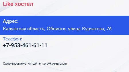 Like, хостел по адресу Калужская область, Обнинск, улица Курчатова, 76 в дальнейшем Организация, размещена в следующих категориях: