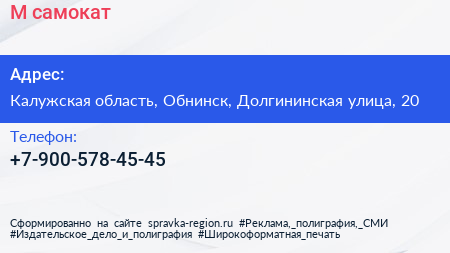 М-самокат по адресу Калужская область, Обнинск, Долгининская улица, 20 в дальнейшем Организация, размещена в следующих категориях: