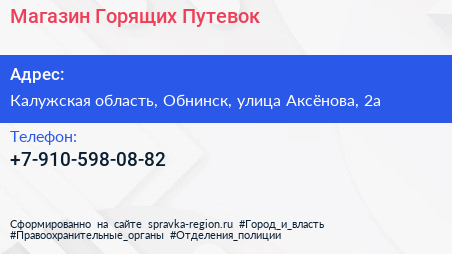 Магазин Горящих Путевок по адресу Калужская область, Обнинск, улица Аксёнова, 2а в дальнейшем Организация, размещена в следующих категориях: