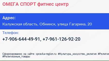 ОМЕГА-СПОРТ, фитнес-центр по адресу Калужская область, Обнинск, улица Гагарина, 20 в дальнейшем Организация, размещена в следующих категориях: