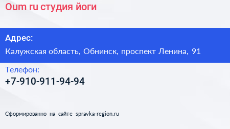 Oum.ru, студия йоги по адресу Калужская область, Обнинск, проспект Ленина, 91 в дальнейшем Организация, размещена в следующих категориях: