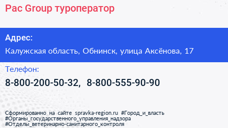 Pac Group, туроператор по адресу Калужская область, Обнинск, улица Аксёнова, 17 в дальнейшем Организация, размещена в следующих категориях: