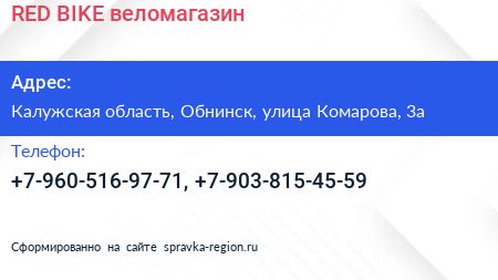 RED BIKE, веломагазин по адресу Калужская область, Обнинск, улица Комарова, 3а в дальнейшем Организация, размещена в следующих категориях: