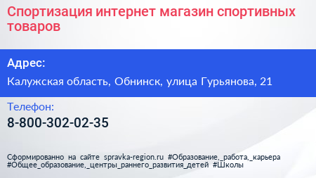Спортизация, интернет-магазин спортивных товаров по адресу Калужская область, Обнинск, улица Гурьянова, 21 в дальнейшем Организация, размещена в следующих категориях: