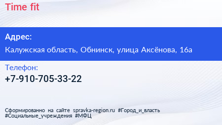 Time fit по адресу Калужская область, Обнинск, улица Аксёнова, 16а в дальнейшем Организация, размещена в следующих категориях: