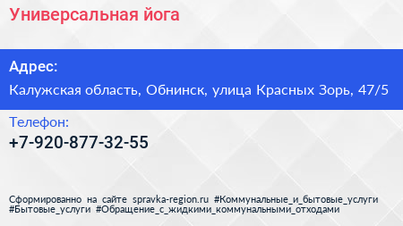 Универсальная йога по адресу Калужская область, Обнинск, улица Красных Зорь, 47/5 в дальнейшем Организация, размещена в следующих категориях: