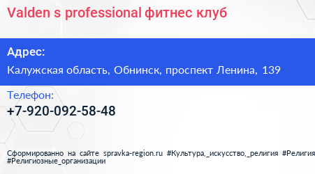 Valden`s professional, фитнес клуб по адресу Калужская область, Обнинск, проспект Ленина, 139 в дальнейшем Организация, размещена в следующих категориях: