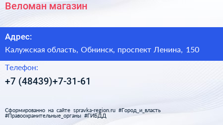 Веломан, магазин по адресу Калужская область, Обнинск, проспект Ленина, 150 в дальнейшем Организация, размещена в следующих категориях: