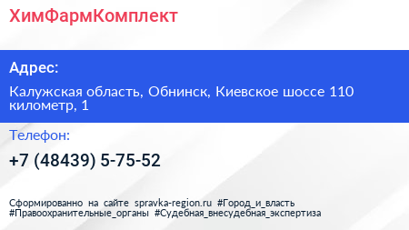 ХимФармКомплект по адресу Калужская область, Обнинск, Киевское шоссе 110 километр, 1 в дальнейшем Организация, размещена в следующих категориях: