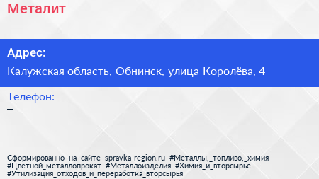 Металит по адресу Калужская область, Обнинск, улица Королёва, 4 в дальнейшем Организация, размещена в следующих категориях:
