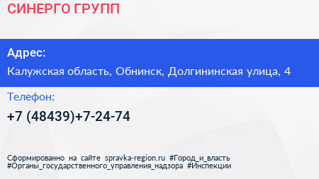 СИНЕРГО ГРУПП по адресу Калужская область, Обнинск, Долгининская улица, 4 в дальнейшем Организация, размещена в следующих категориях: