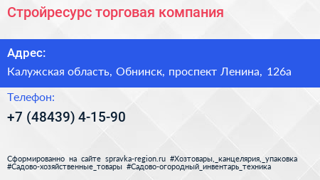 Стройресурс, торговая компания по адресу Калужская область, Обнинск, проспект Ленина, 126а в дальнейшем Организация, размещена в следующих категориях: