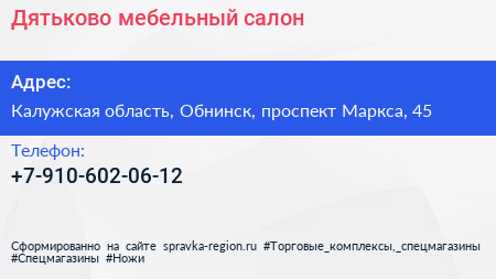 Дятьково, мебельный салон по адресу Калужская область, Обнинск, проспект Маркса, 45 в дальнейшем Организация, размещена в следующих категориях: