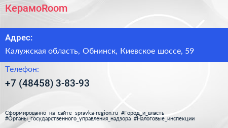 КерамоRoom по адресу Калужская область, Обнинск, Киевское шоссе, 59 в дальнейшем Организация, размещена в следующих категориях: