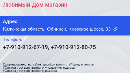 Любимый Дом, магазин по адресу Калужская область, Обнинск, Киевское шоссе, 33 к9 в дальнейшем Организация, размещена в следующих категориях: