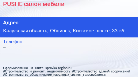 PUSHE, салон мебели по адресу Калужская область, Обнинск, Киевское шоссе, 33 к9 в дальнейшем Организация, размещена в следующих категориях:
