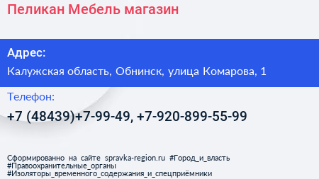 Пеликан-Мебель, магазин по адресу Калужская область, Обнинск, улица Комарова, 1 в дальнейшем Организация, размещена в следующих категориях: