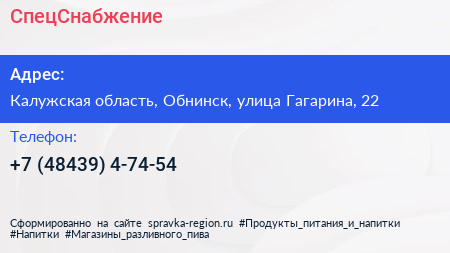 СпецСнабжение по адресу Калужская область, Обнинск, улица Гагарина, 22 в дальнейшем Организация, размещена в следующих категориях: