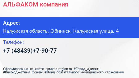 АЛЬФАКОМ, компания по адресу Калужская область, Обнинск, Калужская улица, 4 в дальнейшем Организация, размещена в следующих категориях: