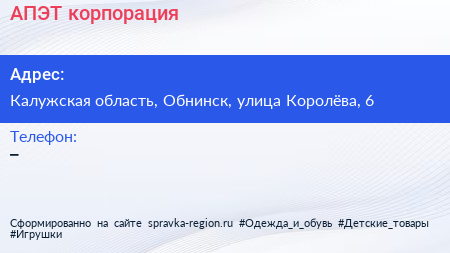 АПЭТ, корпорация по адресу Калужская область, Обнинск, улица Королёва, 6 в дальнейшем Организация, размещена в следующих категориях: