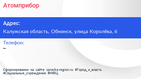 Атомприбор по адресу Калужская область, Обнинск, улица Королёва, 6 в дальнейшем Организация, размещена в следующих категориях: