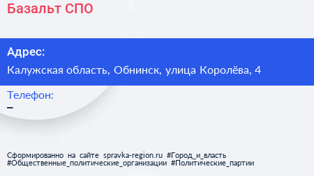 Базальт СПО по адресу Калужская область, Обнинск, улица Королёва, 4 в дальнейшем Организация, размещена в следующих категориях: