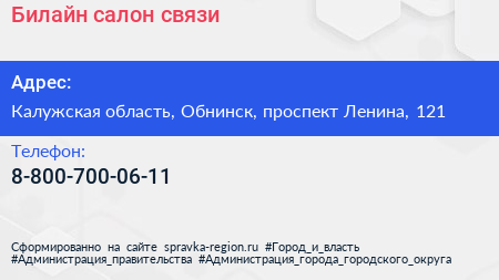 Билайн, салон связи по адресу Калужская область, Обнинск, проспект Ленина, 121 в дальнейшем Организация, размещена в следующих категориях: