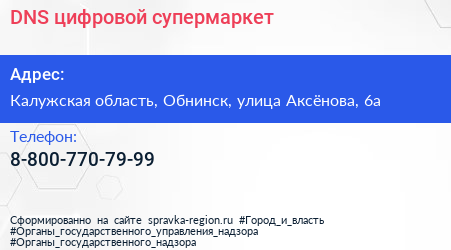 DNS, цифровой супермаркет по адресу Калужская область, Обнинск, улица Аксёнова, 6а в дальнейшем Организация, размещена в следующих категориях: