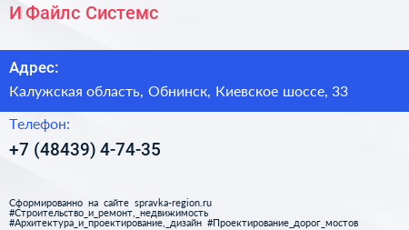 И-Файлс Системс по адресу Калужская область, Обнинск, Киевское шоссе, 33 в дальнейшем Организация, размещена в следующих категориях: