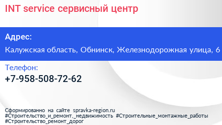 INT service, сервисный центр по адресу Калужская область, Обнинск, Железнодорожная улица, 6 в дальнейшем Организация, размещена в следующих категориях: