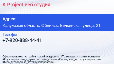 K-Project, веб-студия по адресу Калужская область, Обнинск, Белкинская улица, 21 в дальнейшем Организация, размещена в следующих категориях: