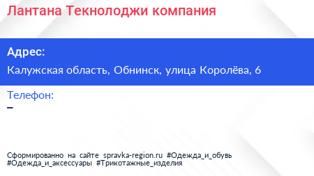 Лантана Текнолоджи, компания по адресу Калужская область, Обнинск, улица Королёва, 6 в дальнейшем Организация, размещена в следующих категориях: