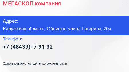 МЕГАСКОП, компания по адресу Калужская область, Обнинск, улица Гагарина, 20а в дальнейшем Организация, размещена в следующих категориях: