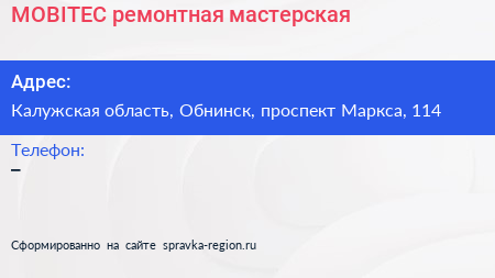 MOBITEC, ремонтная мастерская по адресу Калужская область, Обнинск, проспект Маркса, 114 в дальнейшем Организация, размещена в следующих категориях: