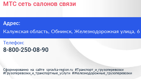 МТС, сеть салонов связи по адресу Калужская область, Обнинск, Железнодорожная улица, 6 в дальнейшем Организация, размещена в следующих категориях: