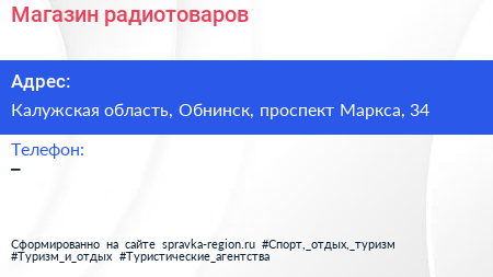 Магазин радиотоваров по адресу Калужская область, Обнинск, проспект Маркса, 34 в дальнейшем Организация, размещена в следующих категориях: