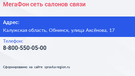 МегаФон, сеть салонов связи по адресу Калужская область, Обнинск, улица Аксёнова, 17 в дальнейшем Организация, размещена в следующих категориях: